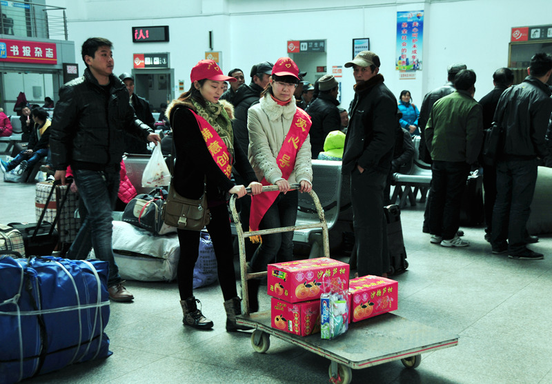 來自揚汽集團和團市委組織的志愿者們有的在進站口向旅客指引車站售票、候車等各個功能區(qū)位置;有的在服務臺回答旅客咨詢;有的在安檢處勸導旅客把攜帶的物品放上危險品檢查儀安檢;有的推著“雷鋒車”幫行李較多的旅客拖運箱包;有的給候車的旅客倒上一杯熱水;有的在檢票口幫助維持現場秩序,避免發(fā)生擁堵;還有的在候車大廳勸導旅客請勿吸煙……