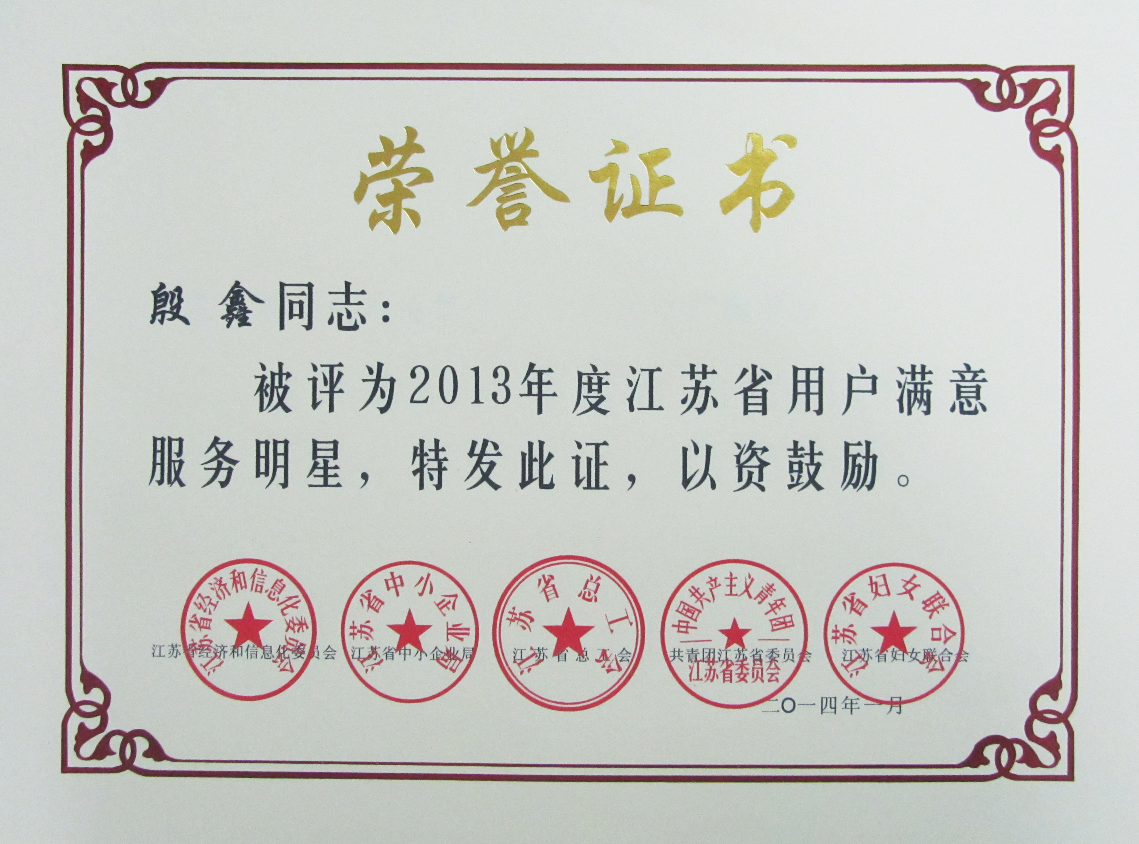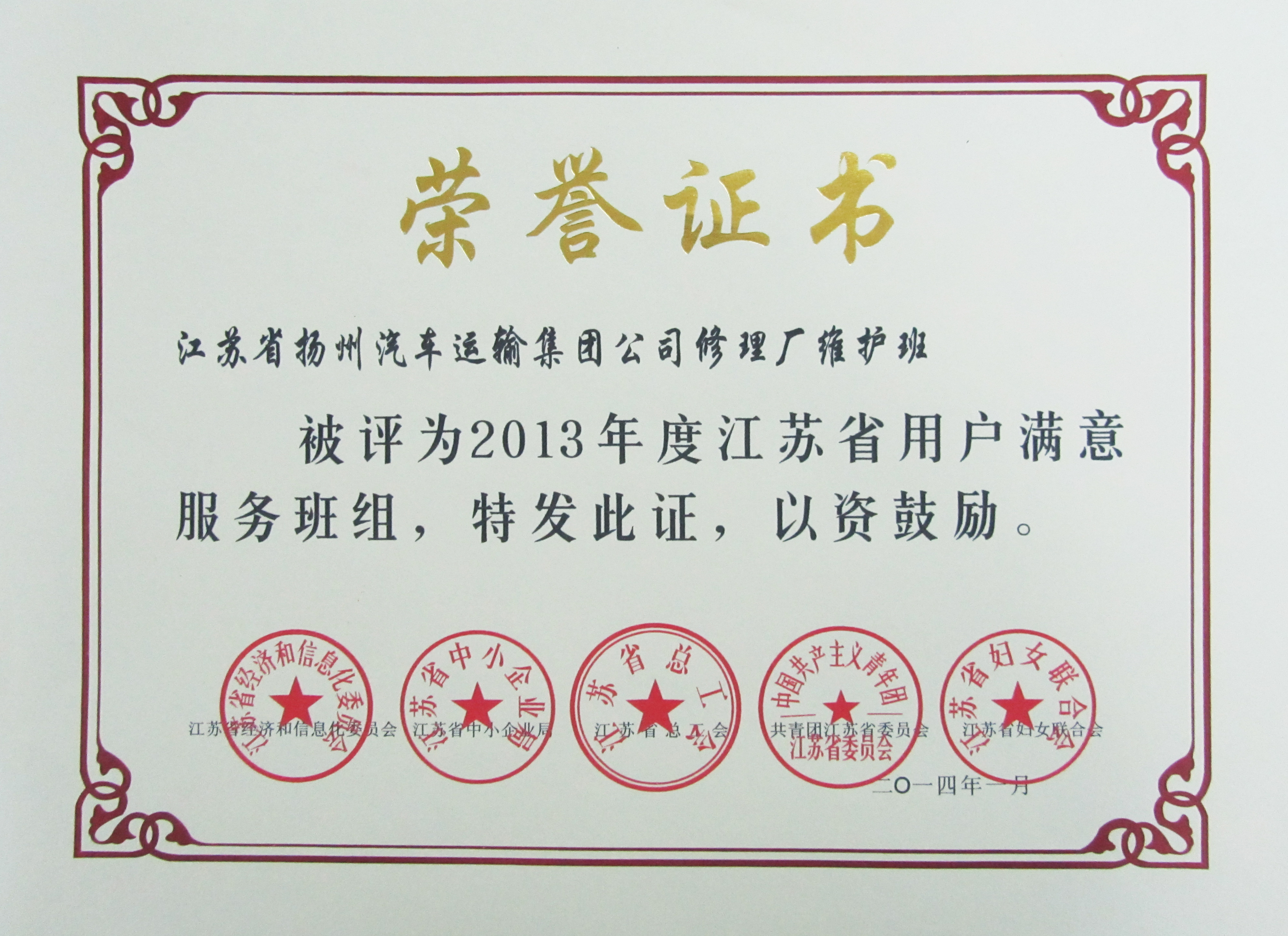 日前,由江蘇省經(jīng)濟(jì)和信息化委員會(huì)、江蘇省總工會(huì)、江蘇省中小企業(yè)局等五家單位聯(lián)合開(kāi)展的2013年度創(chuàng)建“用戶(hù)滿意服務(wù)”活動(dòng)評(píng)審結(jié)果揭曉,我司修理廠維護(hù)班榮獲2013年度江蘇省“用戶(hù)滿意服務(wù)”班組,快客分公司殷鑫同志榮獲2013年度江蘇省“用戶(hù)滿意服務(wù)”明星稱(chēng)號(hào)。