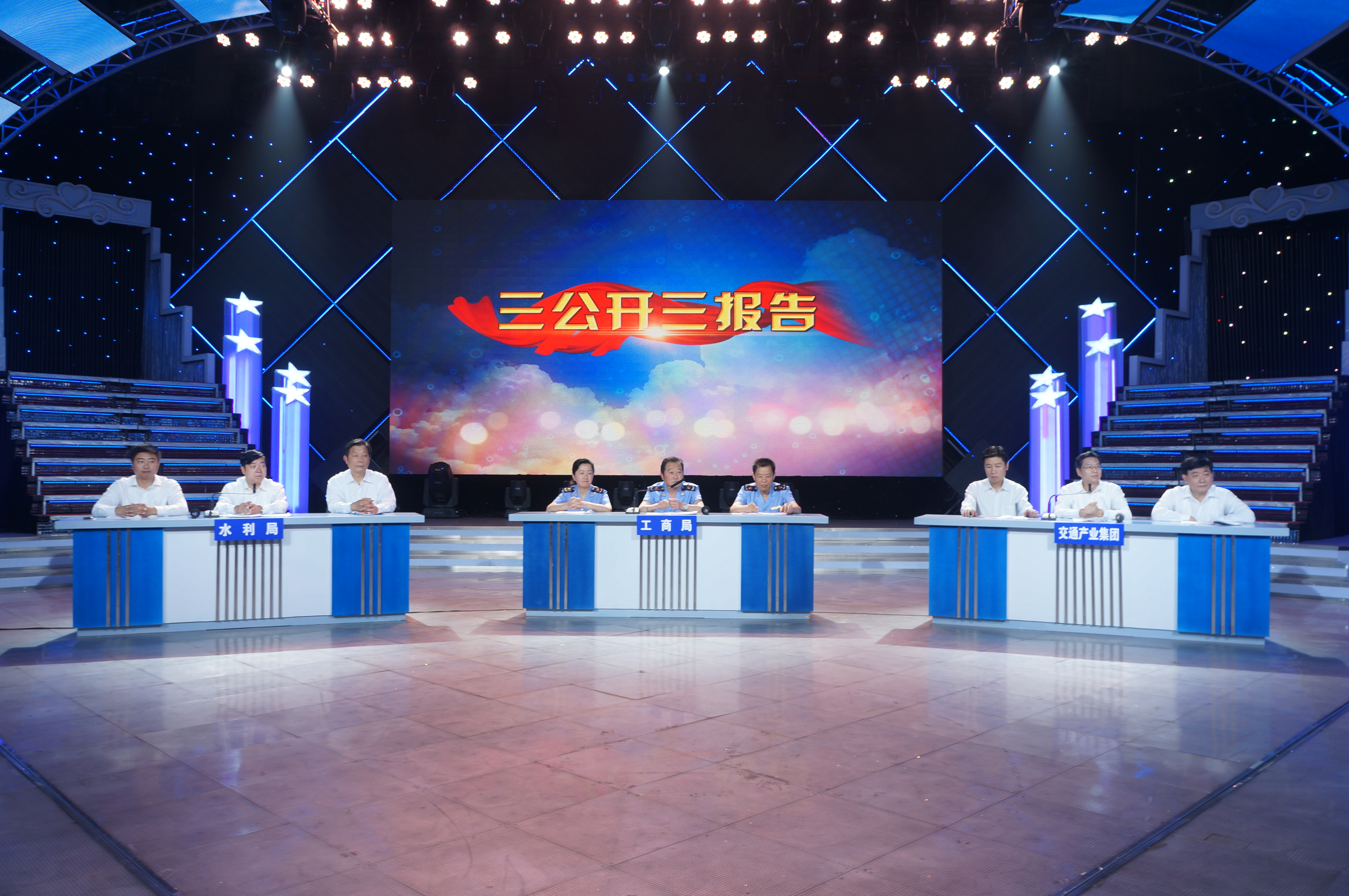 6月29日上午,市交通產(chǎn)業(yè)集團(tuán)董事長(zhǎng)、黨委書記、總經(jīng)理周正權(quán),集團(tuán)公司總經(jīng)理、黨委書記吳忠俊和市公交集團(tuán)領(lǐng)導(dǎo)和走進(jìn)廣電中心電視直播現(xiàn)場(chǎng),與市水利局、工商局共同接受“三公開、三報(bào)告”考評(píng)打分。