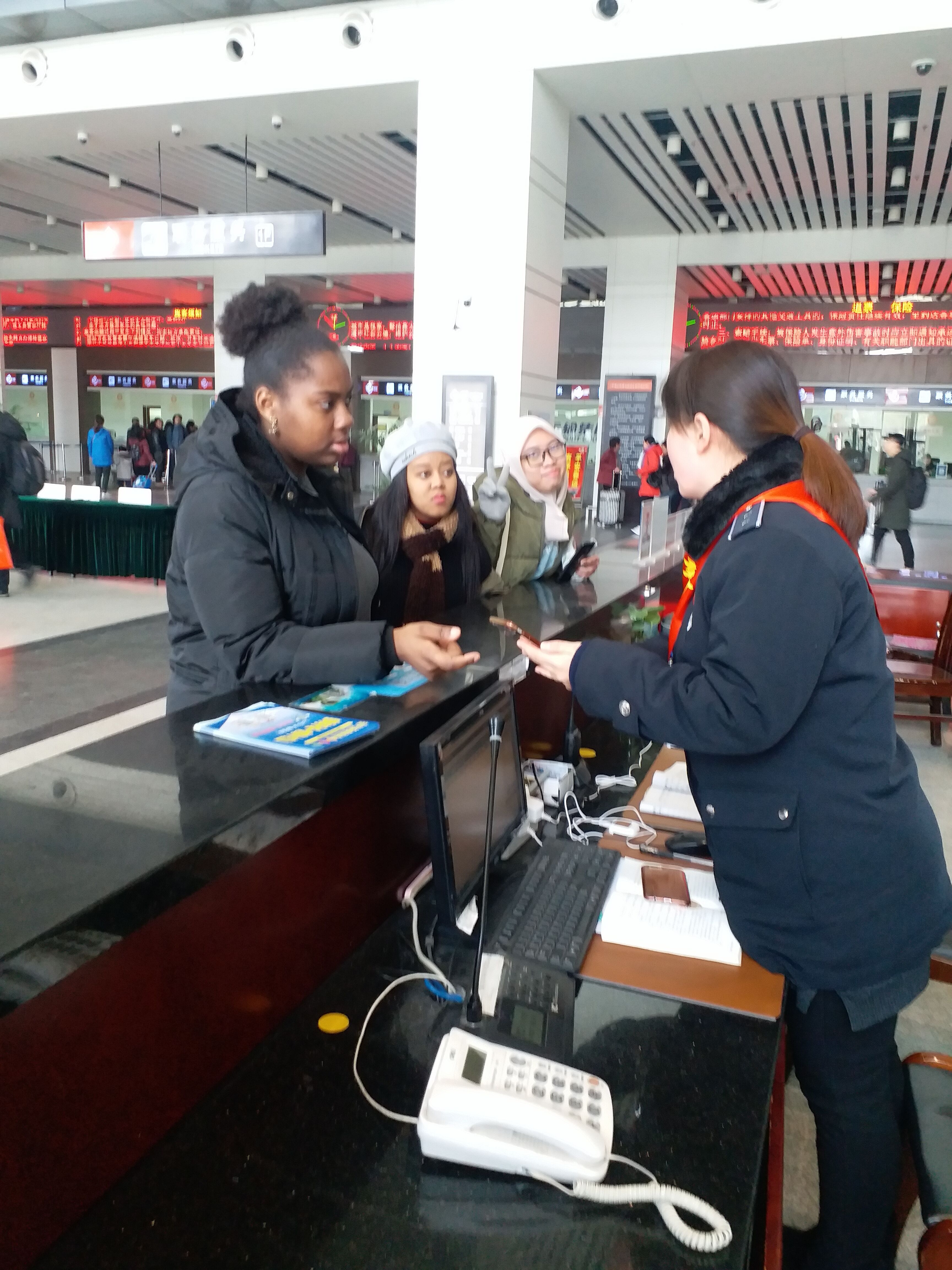 下午12時30分左右,來自揚(yáng)大的南非和印尼的三位女留學(xué)生,來到車站,想乘車去南通與同鄉(xiāng)會面,到了車站后,才發(fā)現(xiàn)去南通需要到揚(yáng)州汽車東站乘車,而且班次的時間在兩點(diǎn),一時性急的三位留學(xué)生沒了主意,操著生硬的中文,來到服務(wù)臺求助。服務(wù)臺工作人員尹海霞熱情地幫助她們查詢了發(fā)往南通的大巴班次,立即為她們購買了已經(jīng)為數(shù)不多的車票?紤]到時間比較緊,尹海霞又將她們帶到公交上客區(qū),送她們上車,趕往東站。印尼的留學(xué)生上車時豎著大拇指說道:“車站漂亮,人更漂亮!”