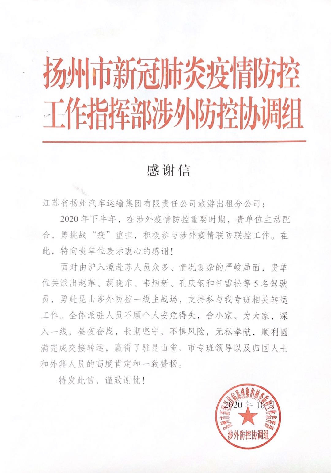 十月下旬,一封承載著市疫情防控指揮部贊譽(yù)的感謝信送至旅游出租分公司。疫情防控指揮部對(duì)第二批參加境外返揚(yáng)人員轉(zhuǎn)運(yùn)工作的五名駕駛員給予了高度評(píng)價(jià),信中表示,他們?cè)诶ド缴嫱夥揽匾痪,長(zhǎng)期堅(jiān)守,晝夜奮戰(zhàn),不懼風(fēng)險(xiǎn),無(wú)私奉獻(xiàn),順利圓滿完成交接轉(zhuǎn)運(yùn),贏得市專班領(lǐng)導(dǎo)以及歸國(guó)人士和外籍人員的高度肯定和一致贊揚(yáng)。