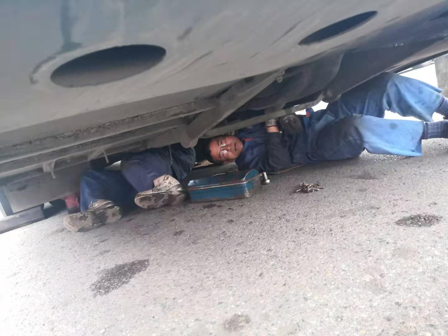11月21日上午客服總調(diào)親自帶隊(duì),修理廠派出維修精英4人,于11:30抵達(dá)。此時(shí)天空不作美,寒風(fēng)刺骨摻和冰冷雨水,搶修環(huán)境更為惡劣,為盡快恢復(fù)班次,師傅們顧不上吃飯,便開始搶修工作,從變速箱附件拆卸、安裝,變速箱落地、吊裝,分離軸承更換、潤(rùn)滑,每個(gè)步驟環(huán)節(jié)都井然有序,連續(xù)作業(yè)3小時(shí)后,于下午14:30搶修成功。此時(shí),師傅們才放心的吃了飯,穿著濕透的工作服返回?fù)P州。他們?cè)谄椒驳墓ぷ鲘徫簧希眯燎诘暮顾,展現(xiàn)了揚(yáng)汽人默默奉獻(xiàn)的精神。