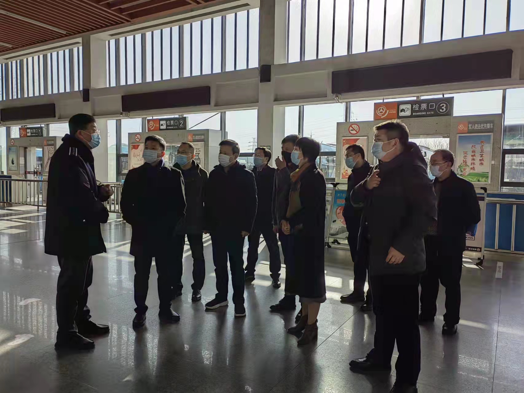 “新年好!你們辛苦了!祝大家新年快樂(lè)!”朱定金一行每到一處都向車(chē)站堅(jiān)守崗位的工作人員表示慰問(wèn)和感謝,實(shí)地查看了進(jìn)出站口、候車(chē)大廳和發(fā)車(chē)平臺(tái)等區(qū)域,通過(guò)聽(tīng)取匯報(bào)、溝通交流詳細(xì)了解了江都汽車(chē)站現(xiàn)階段疫情防控工作落實(shí)情況。